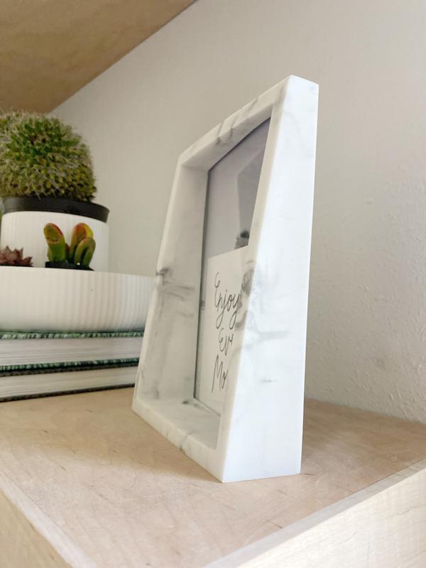 Our edge frame just came in and I already love it! For the price I think the quality is super nice. The marble like material is really cute and the asymmetric angles make it super trendy feeling. I love how well it fits into our space! The only question with it is what picture I choose to put in it.