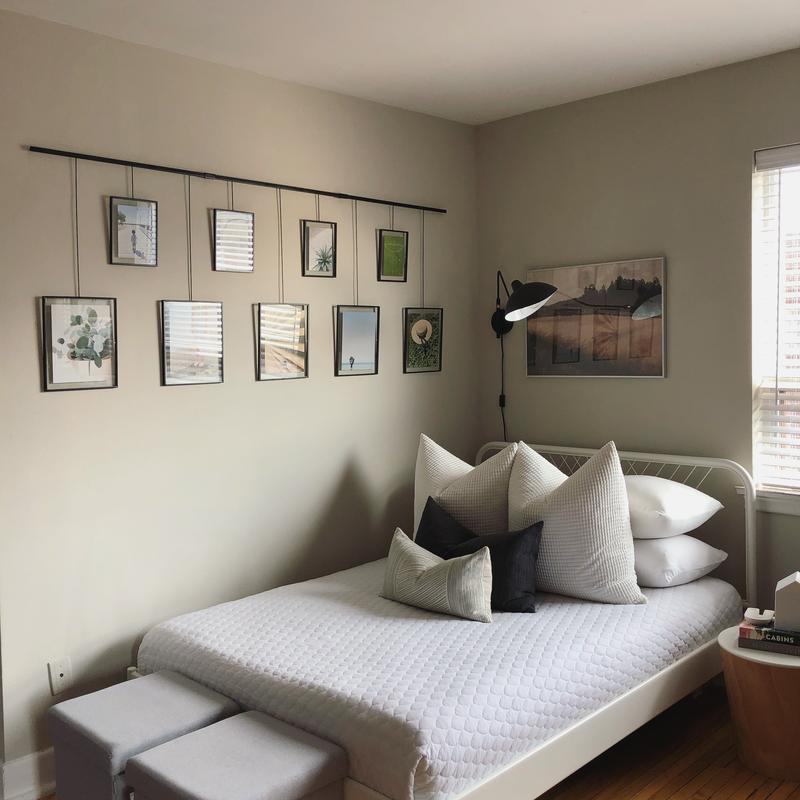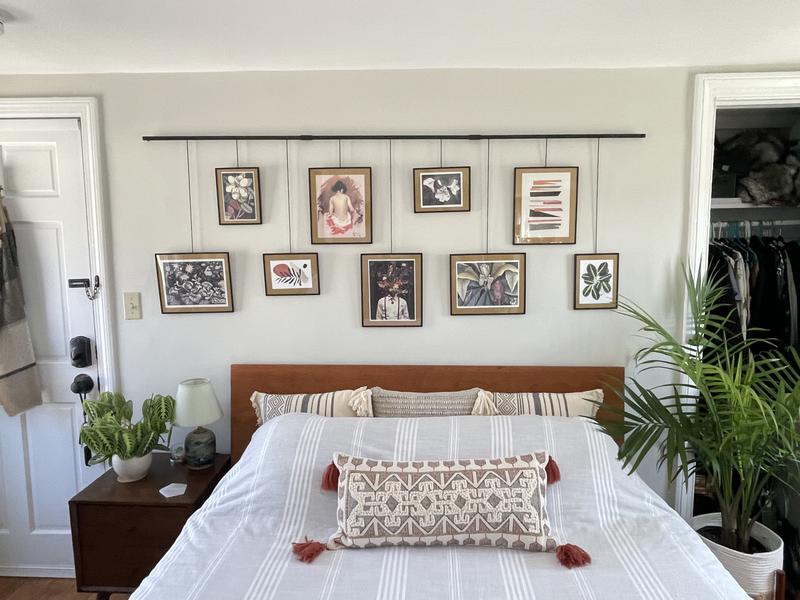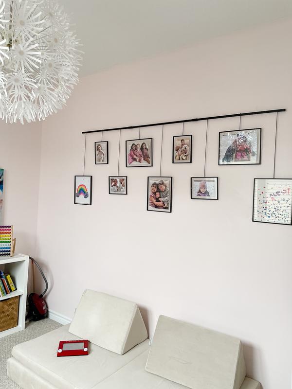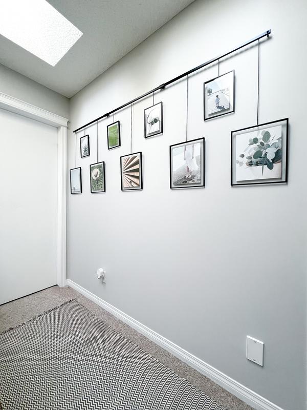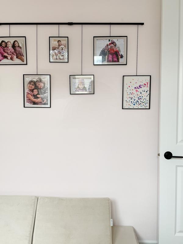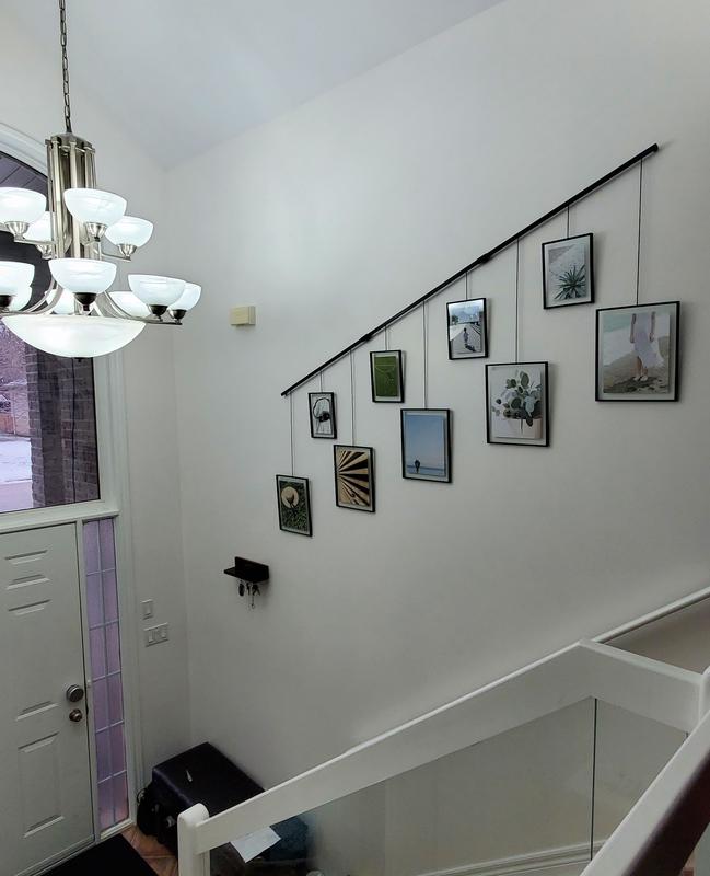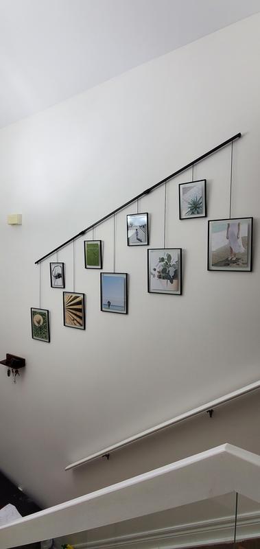 We bought this frame system a while back. It is good looking and the easiest way to hang a series of pictures so that they hang evenly. Good for use on a medium large wall and with a sloped ceiling.