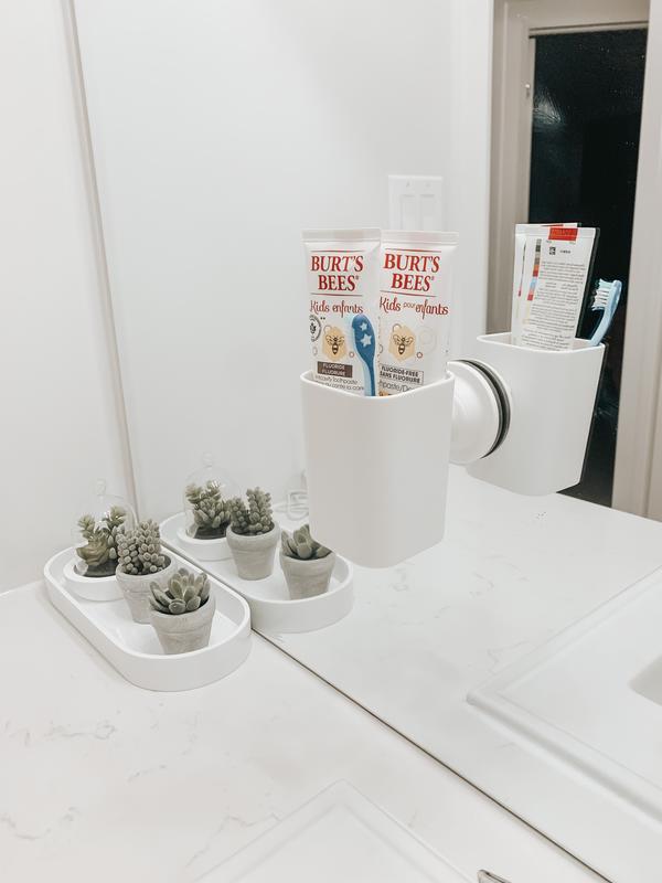 I had been looking for a long time for a solution to keep bathroom counters free of clutter.. this is the solution… it keeps my toothbrush and toothpaste off the counter and easily adheres to the mirror .. up off the counter!! Easy to remove for cleaning.. a big win !
