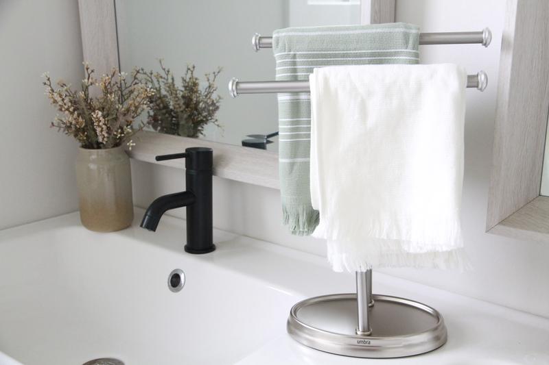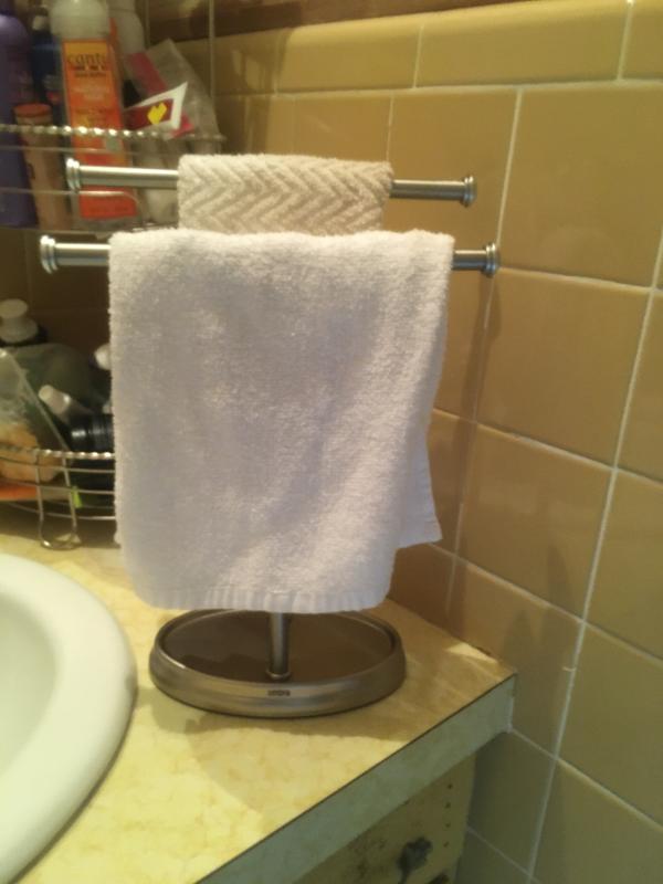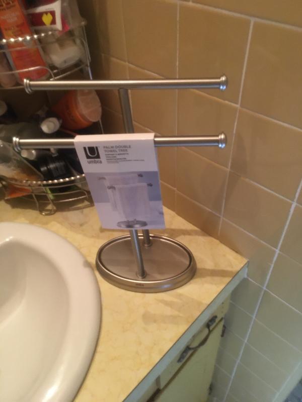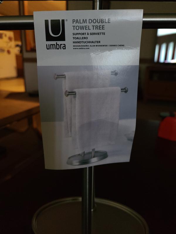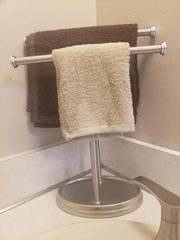 The Umbra Palm Tree Towel Rack is elegant and easy to assemble. One does need slightly shorter than average towels to hang on it or they droop on the counter, but I've actually just been draping one average-sized hand towel over both hanging rods, which still looks perfectly nice and creates additional air flow for drying. I like the towel rack and would recommend it.