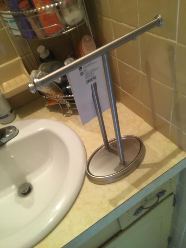 Similar to the toilet paper dispenser, this towel holder needs some extra weight added to the base. It tips over easily when I'm wiping my hands on a towel that I have on this holder. Its pretty and I like that the finish on it is matte since I personally don't like chrome. The lip on the base is a nice touch for holding any jewelery while you do your dishes. This added functionality isnt normally seen in something basic like a towel holder so I appreciate this detail.