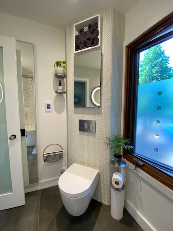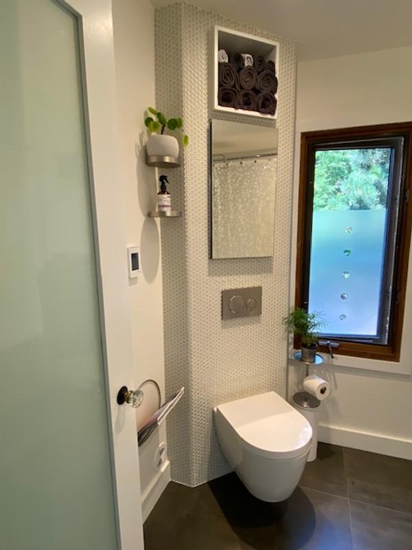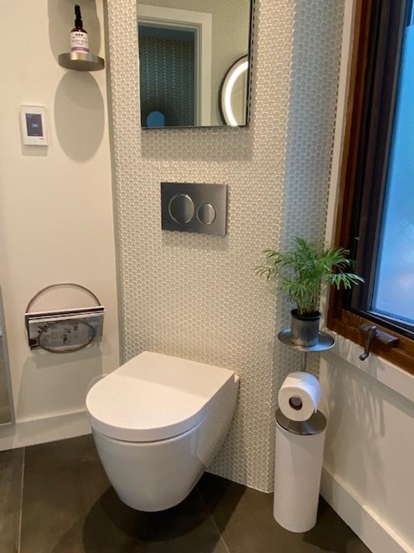 We bought this for our basement laundry room that has a toilet area. Love it. You can set your phone on the top plate!