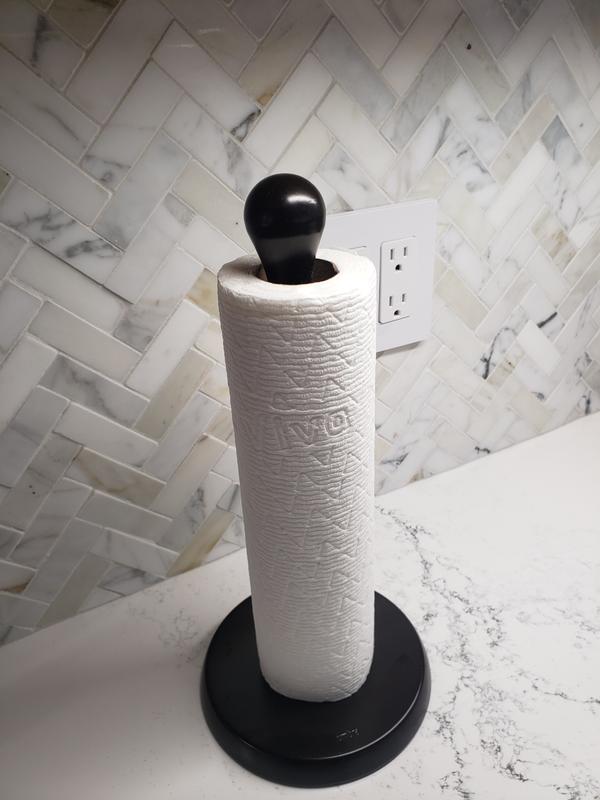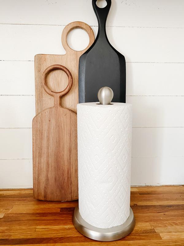 This paper towel holder is the best. The weighted bottom and finned spindle holds it steady, allowing you to rip off a paper towel one-handed.