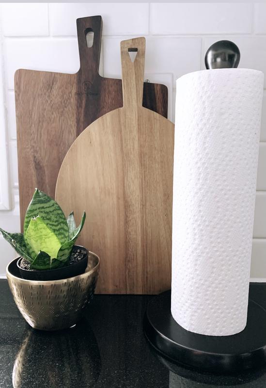 Love the simple design. Also love that the base is weighted so papertowels are readily available and the entire papertowel holder doesn't move.