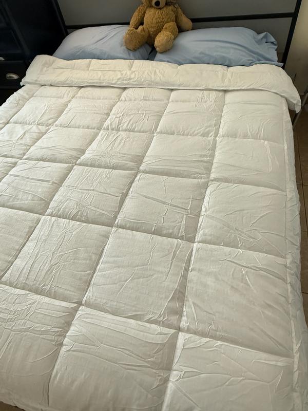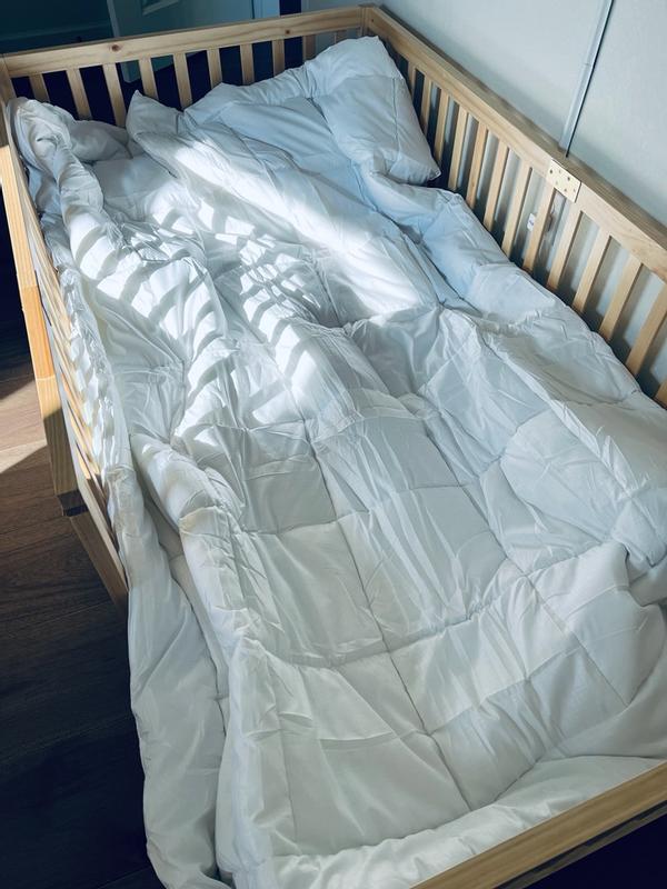 Perfect size for my daughter’s floor twin bed. The comforter is light and can work for warmer months as well as for colder months. Beautifully made and white always looks clean and fresh. I am very pleased.
