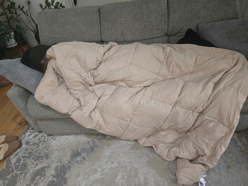 Light enough for a couch, heavy enough for a bed. Super comfy and breathable, a great deal for the price. Since it is down it can be folded to be compact but has a large comfort to it.