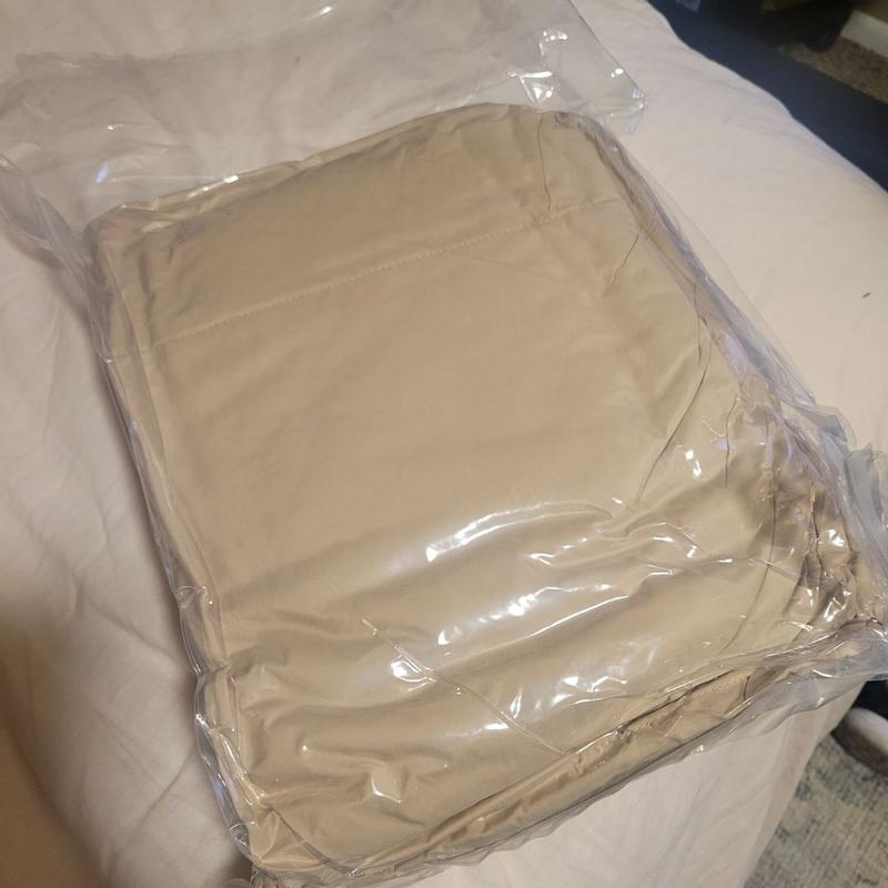 I was a little worried about the color, but it actually is a nice neutral. It’s a medium thickness not too warm. Definitely breathable. I love having a nice comfy blanket to snuggle up with.