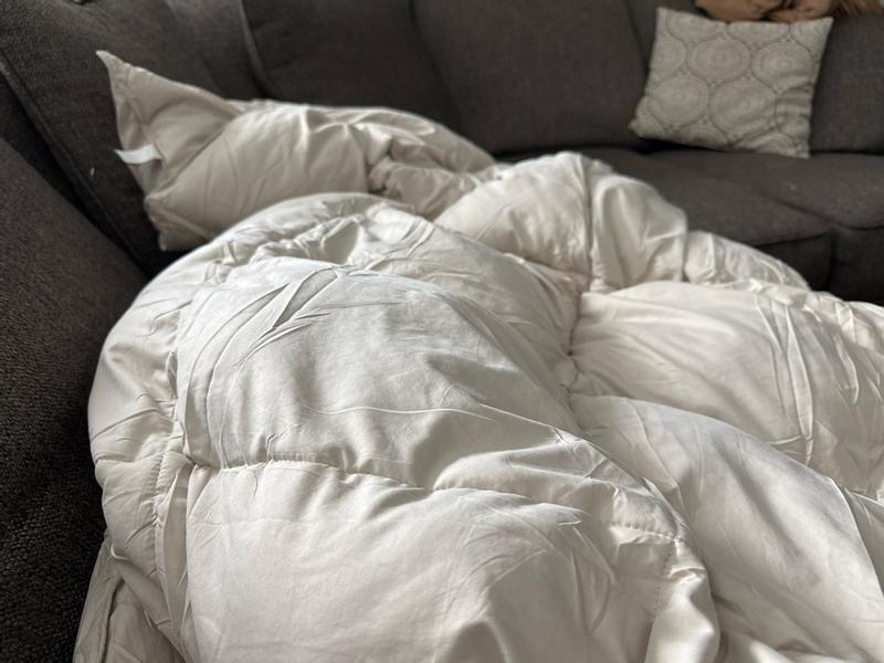This down comforter is amazing, I’m so pleasantly surprised. It’s super cozy, warm, and fluffy! It seems pretty breathable, but I haven’t put it into a duvet cover so it still needs to be seen. We don’t have a twin sized bed but we have a giant couch so this is perfect for our movie nights now that it’s getting colder out!