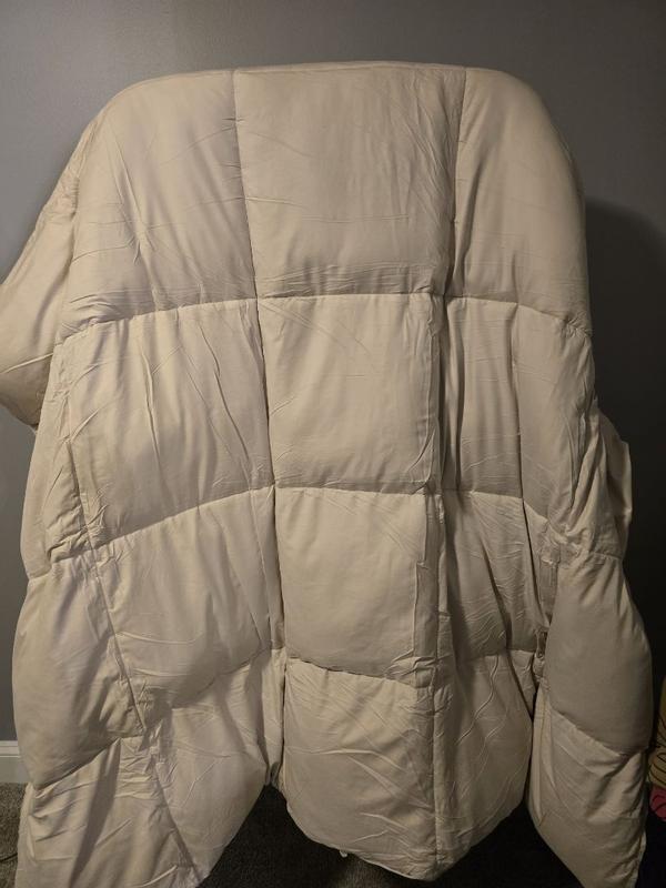 This is such a comfortable down fiber comforter that is perfect for the cold Chicago nights. This comforter also has a little bit of weight, nothing too crazy to keep you feeling warm and comfortable all night long. Just a little note, the comforter did have a weird smell right out of the packaging so I could recommend airing it out before use.