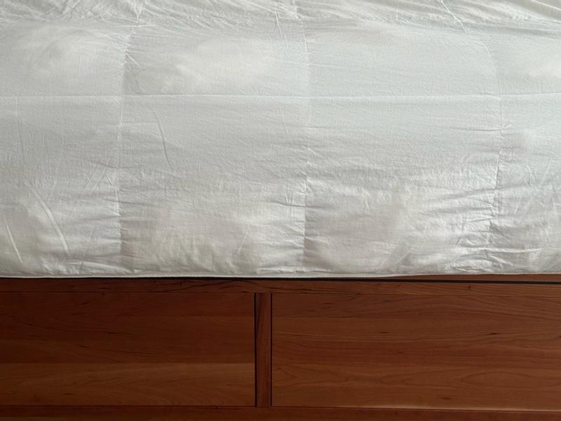 I like this down comforter. It is lightweight, soft and warm. As I just took it out from the package, it has some wrinkles now. But I can already feel that it is so lightweight and warm.
