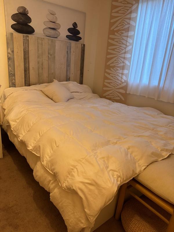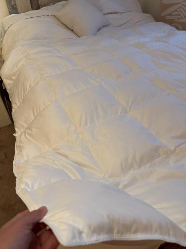 Surprisingly happy with this duvet. It’s still big enough I can use it on our queen sized bed when it’s too warm in California. Super good quality and the touch - feel very luxurious. Looks good also without a cover (but very wait so might get dirty). It’s been out and used for a good month and doesn’t look used at all. I will know more in the upcoming years but so far definitely recommend it.