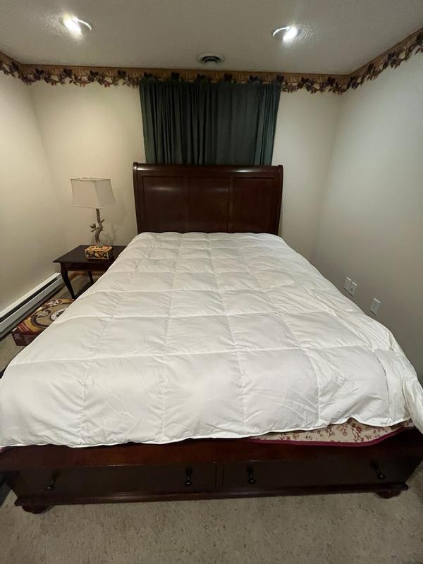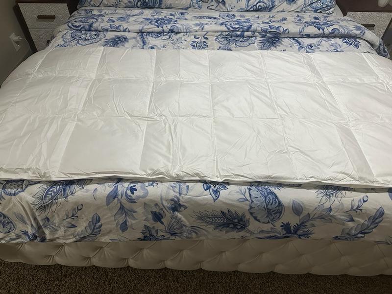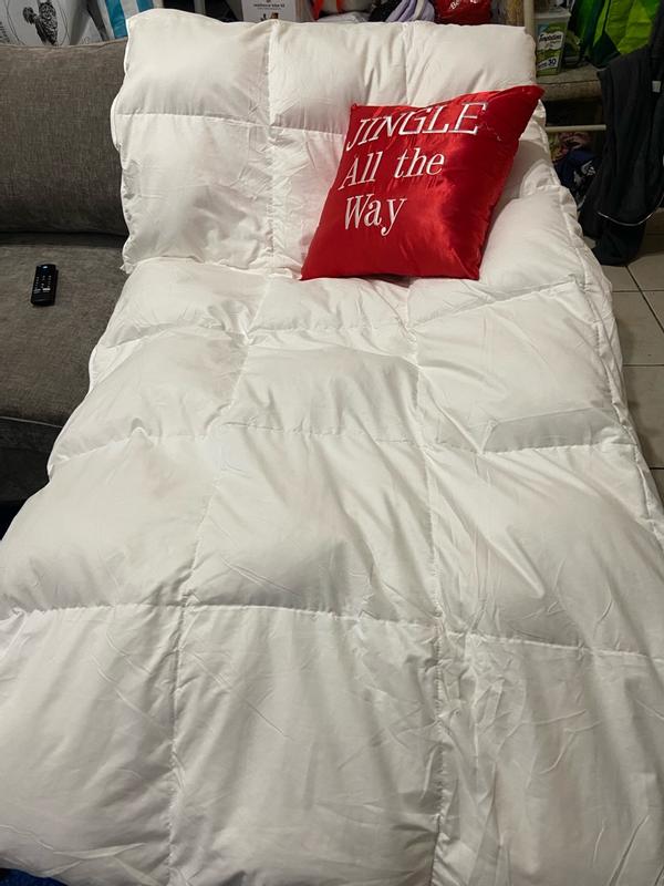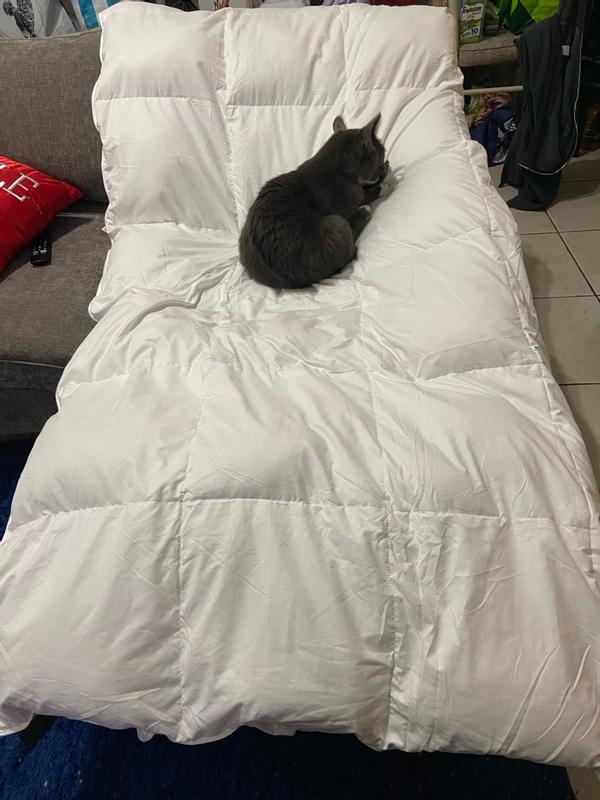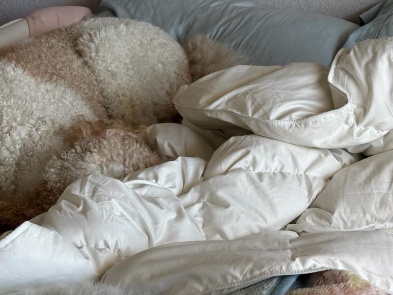 ⭐️⭐️⭐️⭐️⭐️ — Medium Weight 360 Thread Count Down & Feather Blanket Review This medium-weight down and feather blanket has instantly become a favorite in my home. The 360 thread count gives it such a soft, smooth feel—luxurious without being heavy. It’s perfectly balanced: warm enough to feel snuggly, but breathable so you don’t wake up overheated. The loft is just right too. It has that cozy, cloud-like fluff that makes you want to climb right in and stay there. And I’m not the only one who’s obsessed—my golden doodle absolutely loves cuddling up with it. The moment it’s on the bed or the couch, he’s right there making himself comfortable like it was made for him. It holds its shape well, doesn’t shed feathers, and gives you that high-end hotel comfort without the high-end price. If you want a blanket that feels dreamy, durable, and pet-approved, this one is 100% worth it.