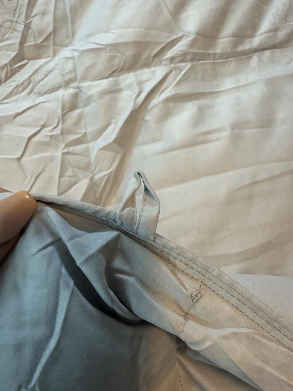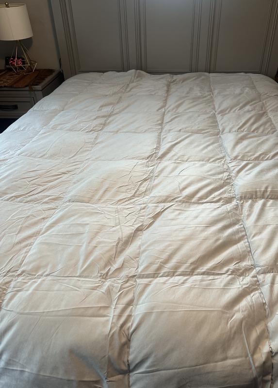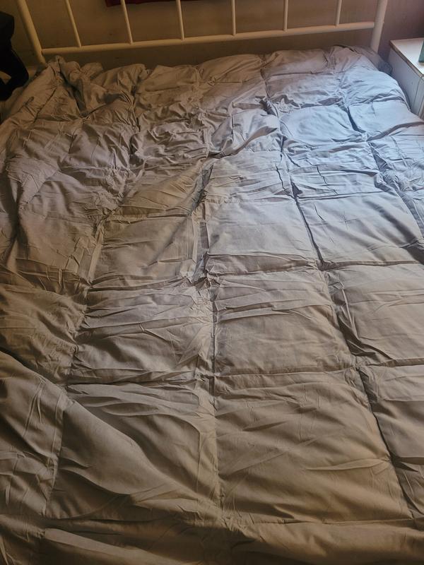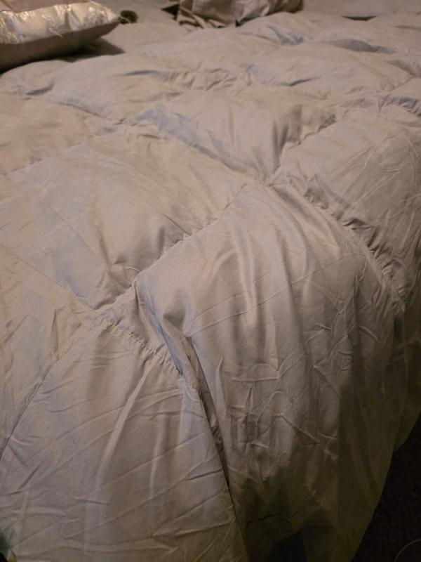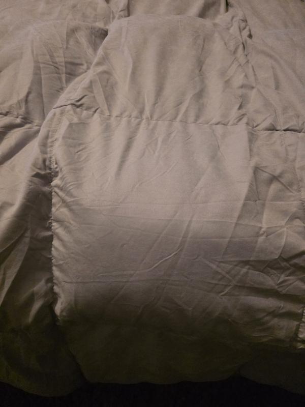 I really like this comforter – the quality, softness, and medium weight are all excellent. It feels cozy without being too warm or heavy, making it great for year-round. I just want to note that the color is actually a very light grey. It’s subtle and looks clean, but worth mentioning if you were expecting something closer to bright white. A nice bonus is the corner tags that let you tie it securely to a duvet cover – a small detail that makes a big difference. Only con: there were a few tiny splatter-like stains, possibly from the dyeing process. They’re very minor and won’t matter once it’s inside a duvet cover, but still worth noting. Overall, I’m really pleased with this comforter. It’s well-made and comfortable with just a small imperfection.