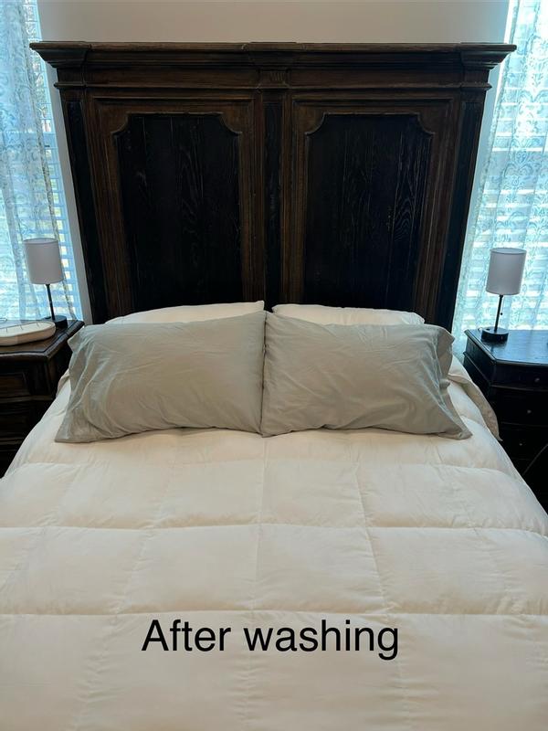 Place the comforter in a ventilated place for 24 hours to return its original fluffy. This is a Warm down comforter that fits my king size bed well. It is super warm and well made. It is also gorgeous and heavy. All people in my household love it. We sleep great with it.