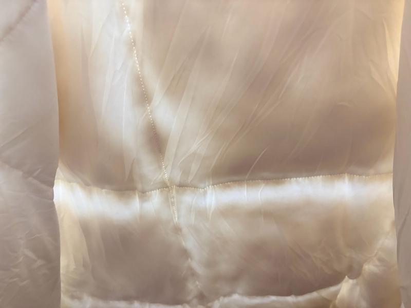 The comforter has a satin finish, and very smooth and fluffy. It got some dense to it, not heavy. It’s definitely feather but no prickly ends. It’s warm. Hold heats in. Must get!