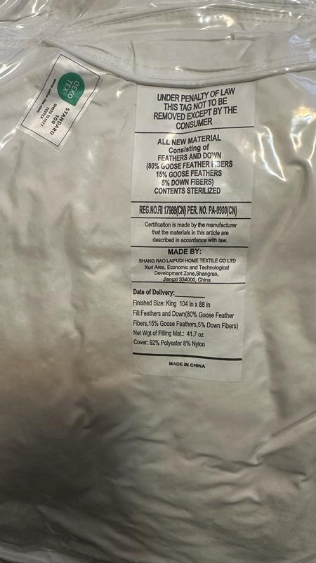This king sized comforter arrived completely sealed and took a couple of hours to unseal and reshape. I did not smell any odors on the comforter. This comforter is beautiful in its simplicity. I do have a Queen size bed and this is a king sized comforter as I prefer a larger comforter for the look on my bed and for coziness. This is a lightweight down comforter and it works great for my husband and myself. It provides enough warmth for me but not too much for my husband so he’s not sweating all night. The comforters cooling material is great for keeping my husband comfortable and it truly is noiseless. I also washed and dried the comforter for my review and it washed up beautifully as well as dried very quickly as well as took most wrinkles out. I highly recommend this goose feathered down noiseless comforter from Unikome.