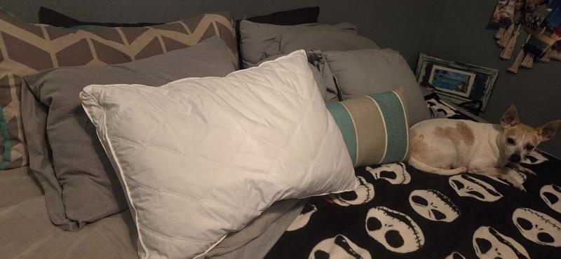 I like these pillows a lot because they have the fluffiness of a down pillow but are still firm enough. I sleep really well on them. They also don’t seem to have that down feather smell which is a huge bonus.