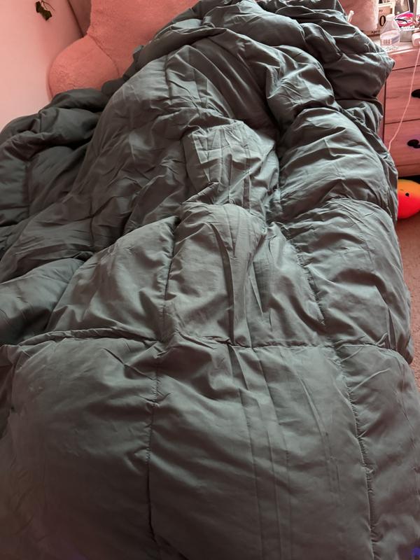 This down comforter is just the right weight, not too warm either. Feels and looks great even without a duvet cover on too.