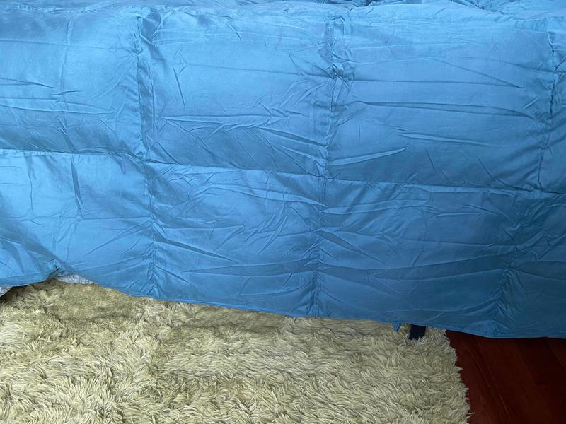 Very nice covering, and well made. Hopefully the feathers will stay in their own boxes!! Previously purchased down comforters had feathers move from side to side. Hard to keep them where they belong!