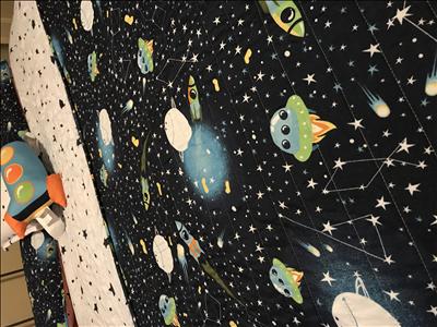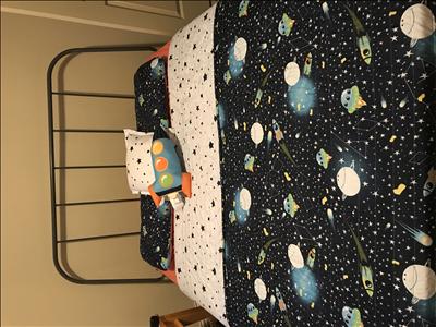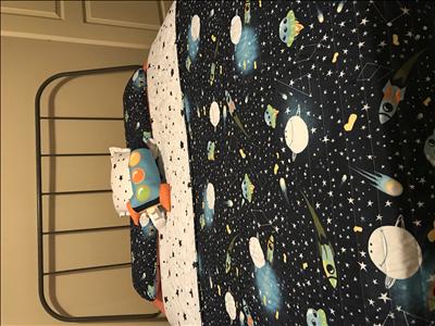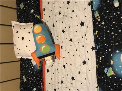 My kiddo just turned 2 so we are in unchartered territory when getting him to sleep in his NEW big boy bed. We did a space themed room and were absolutely excited when finding this bedding set. We were blown away when it arrived in the mail. The quality is out of this world, its soft and its super cute. My little one loves it! The rocket pillow is amazing too!