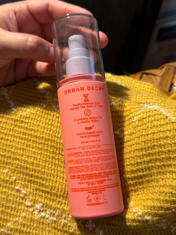 I’m very happy with this product. I like urban decay overall and this setting spray met those expectations. It gives a great mattifying effect. I see a huge difference from when I do my makeup with vs without it. It smells good. Was a good size that was easy to handle. It’s just overall a good product that’s presented well.