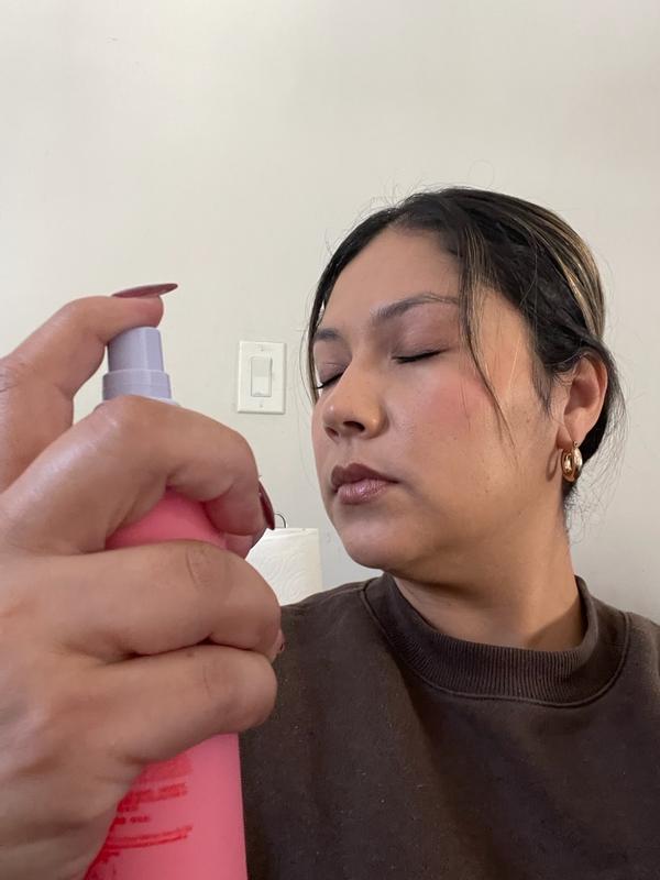 • Holding the setting spray 8-10" away from your face, mist in an "X" and "T" formation 2-4 times, until your face is fully covered