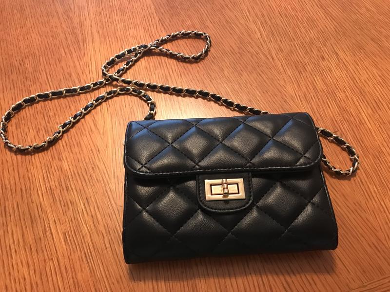 Great quality and size. I have this in white and black. Wear as a crossbody with dresses. Fits my phone, a lipstick and credit card.