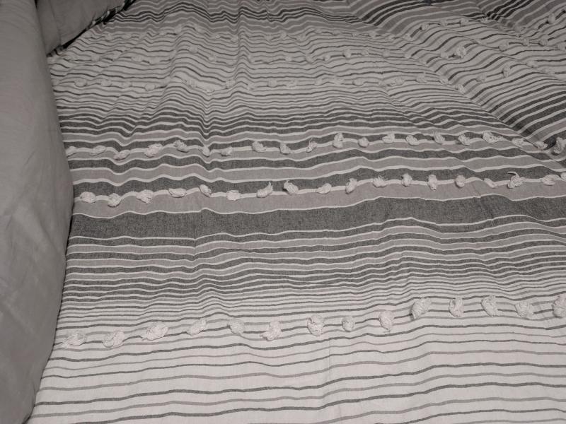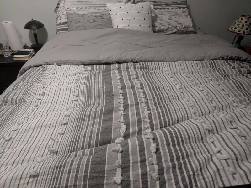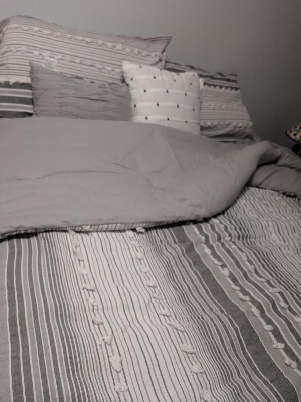 This bedding set is so cute. I love how thick the comforter is! It’s super thick with cute tassels and vertical lines to make my bed look longer. It’s classy and adult like without trying to hard.