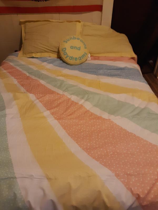This comforter set is super cute, bright, and fun! Goes perfectly with my 2 year olds room decor (pastels, rainbow, sunshine). We got the twin size set, which is too big for my daughter’s toddler size bed, but it makes the bed cozy and fun to snuggle in. The round pillow is also a cute touch. The material isn’t super soft but it does seem durable.