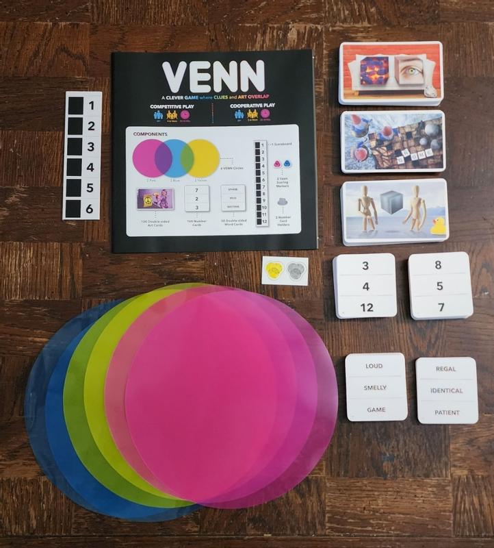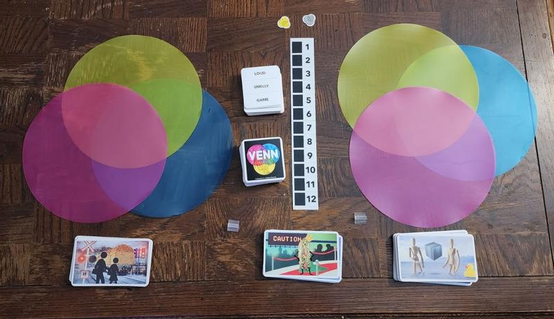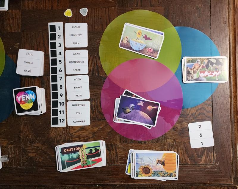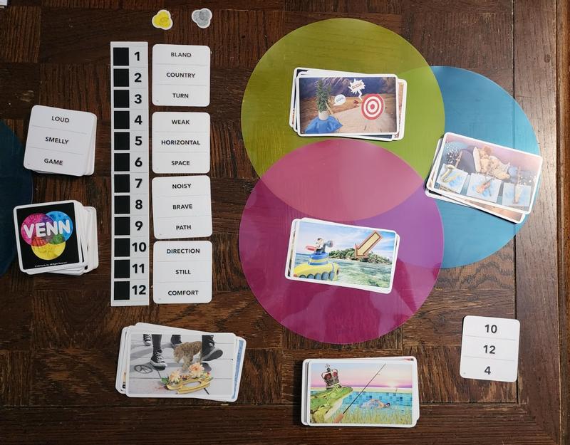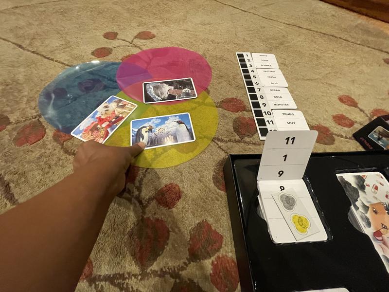 Draw a number card with three different numbers on it from 1-12. The numbers determine the words you need to give clues to by picking art cards to describe the three words and placing them within the Venn circles for others to try and guess Loved the concept most of all! Also loved that it has immense possibilities, and can be varied to adjust the difficulty based on who is playing. For this is one game that can easily challenge players. And it is wonderful that we can play this with as few as 2 players (co-operative mode) but the more the merrier is also true for this one, based on what I see. So will definitely be playing with a larger group next time around.