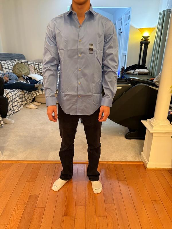 This wrinkle free slim fit dress shirt is the perfect basic to have on hand in closet for an easy to wear item. Collar is sturdy but flexible. Fabric is lightweight and breathable. No button points on the sleeve for added comfort. I recommend this shirt!