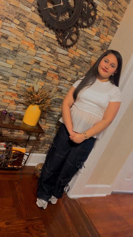 super cute and comfy baggy jeans had to go down a size as it's just S, M, L, etc. i originally got a M but exchanged for S. I am a size 4/6 usually. very cute with the bow accents.