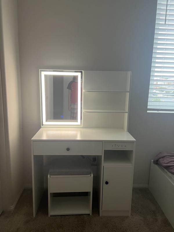 it is so pretty, I love doing makeup and the mirror was bigger than expected, I love how it already comes with the chair, (Ps tho, it comes with the cushion thing that is not attached and when you move it moves around too, it’s a little annoying but that’s okay) Overall 5 stars, fast shipping. MUST BUYY!
