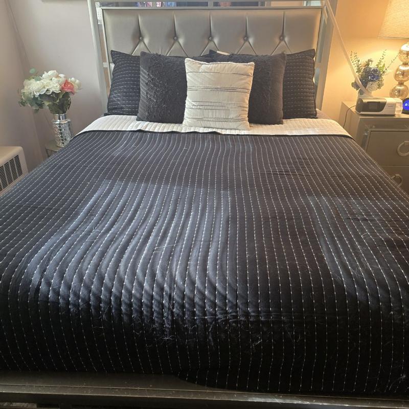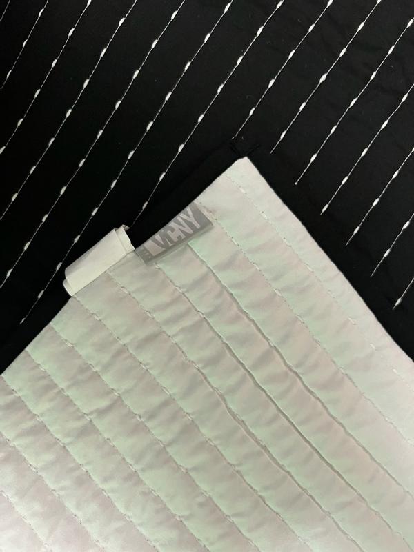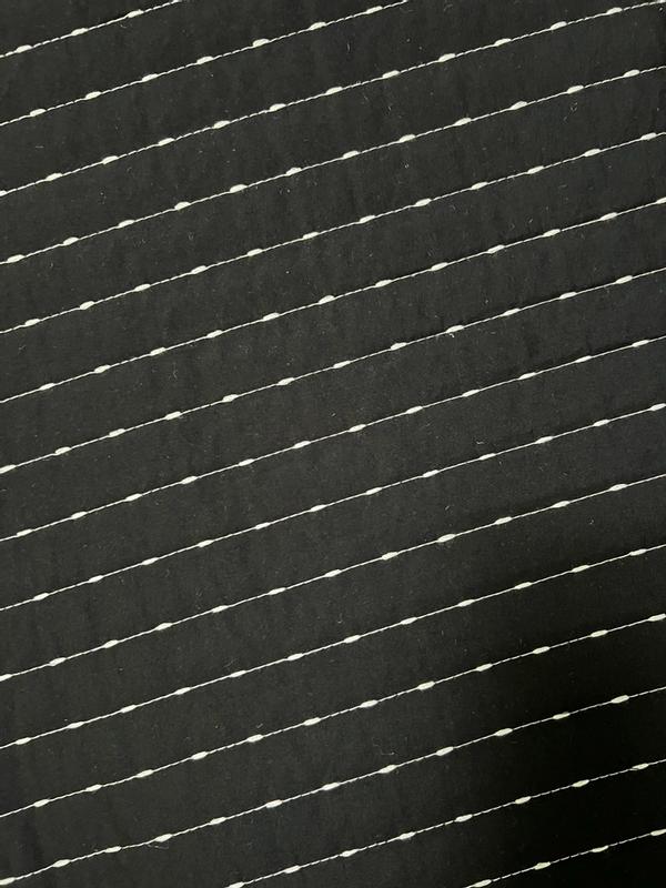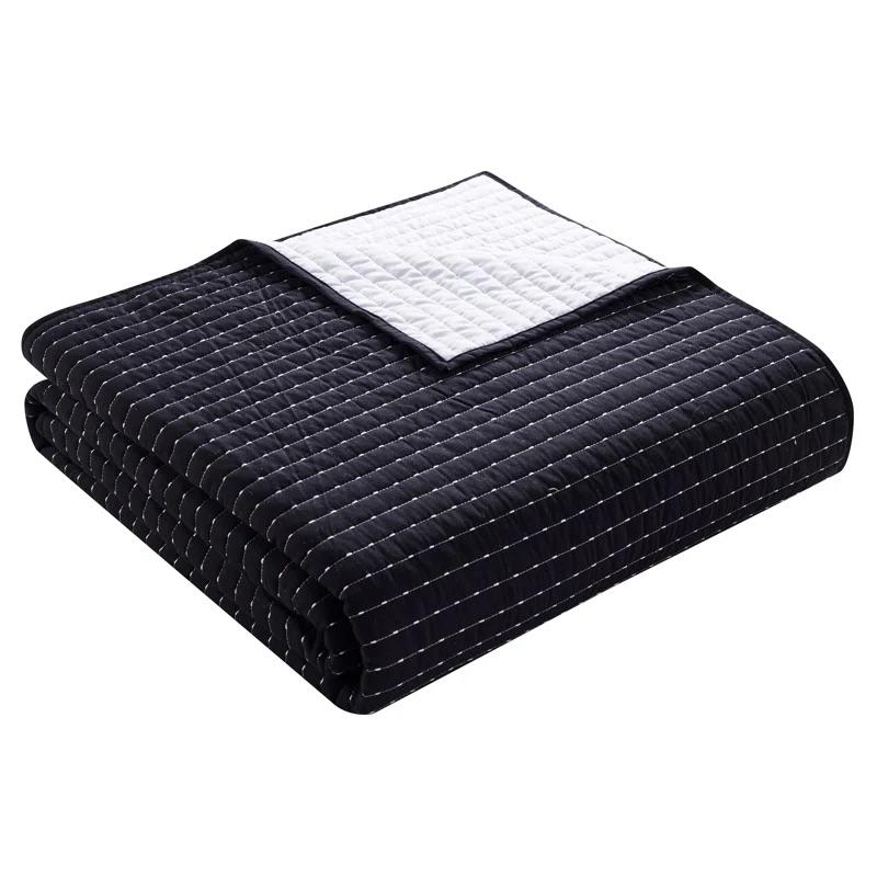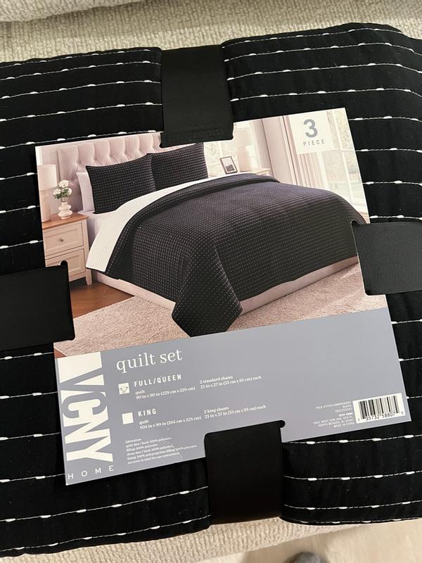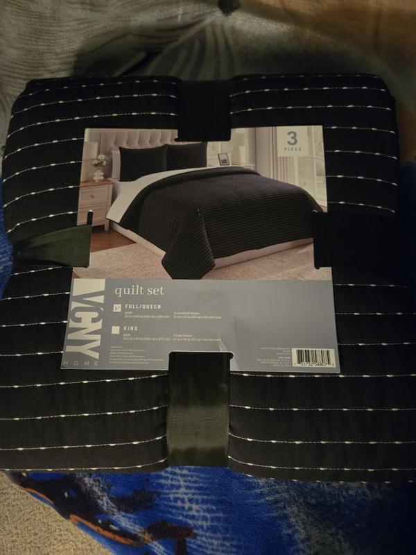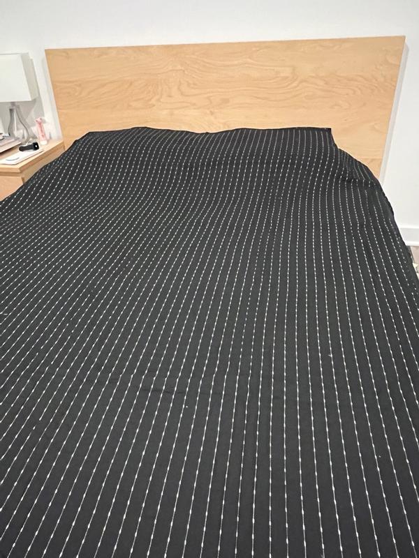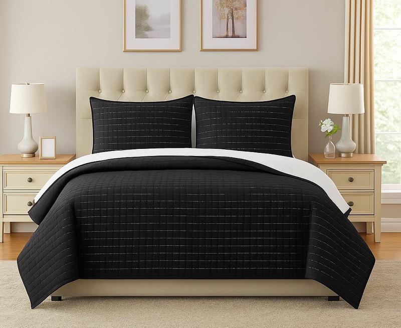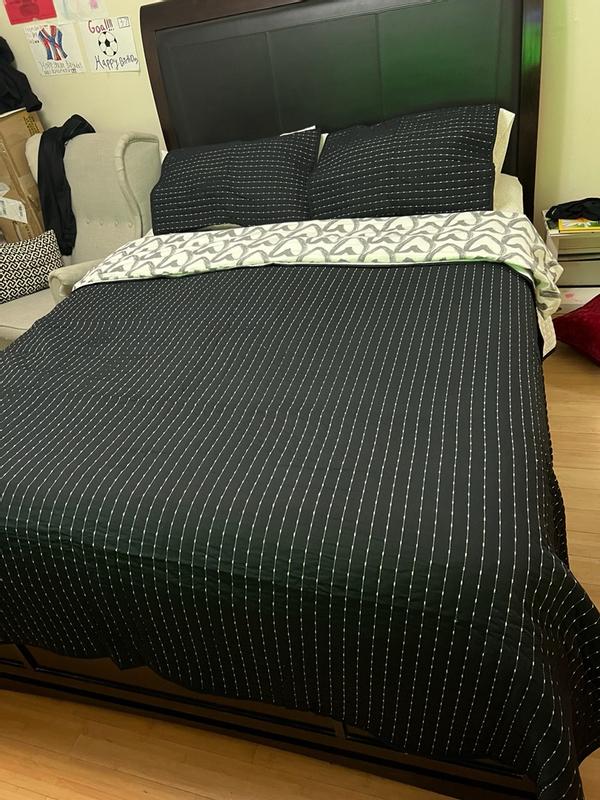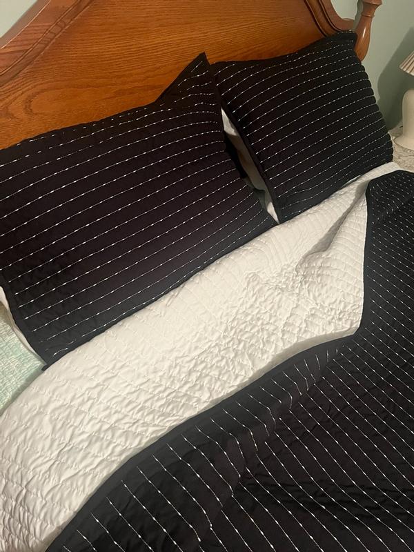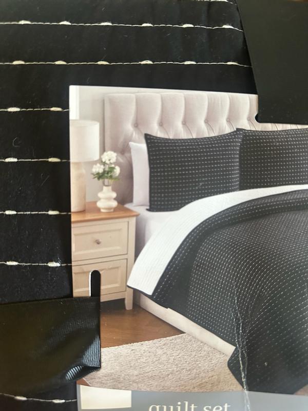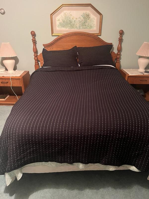 The quilt set fits perfectly on a queen size bed, offering generous coverage on all sides without being overly bulky. It drapes nicely and stays in place throughout the night. The embroidered pick stitch pattern adds a subtle, modern touch that complements both neutral and bold decor. The minimalist black and white color palette looks sleek and clean. After multiple washes, the fabric holds up well with no fading or fraying. The stitching remains intact, and the quilt keeps its shape. Soft to the touch and lightweight, this microfiber quilt is perfect for year round use.