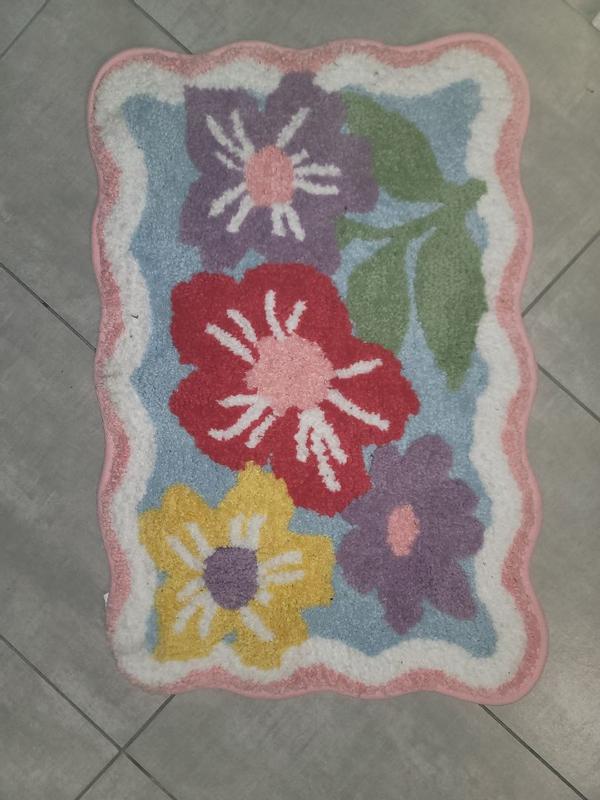 This is such a beautiful bath rug, with colorful flowers. The material of the rug itself is super soft and comfortable on the feet. The rug didn't take long to dry as I left it to air dry. Great product!