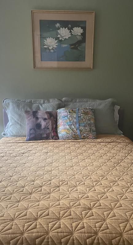This bedspread is exactly what we hoped for! First, it’s pretty, but most importantly, a King size covers the sheets on a Queen size bed! You have plenty of spread to be cozy & snug, plus it’s the perfect feel, not too thin or thick for Houston heat or AC cold. You’ll love it!