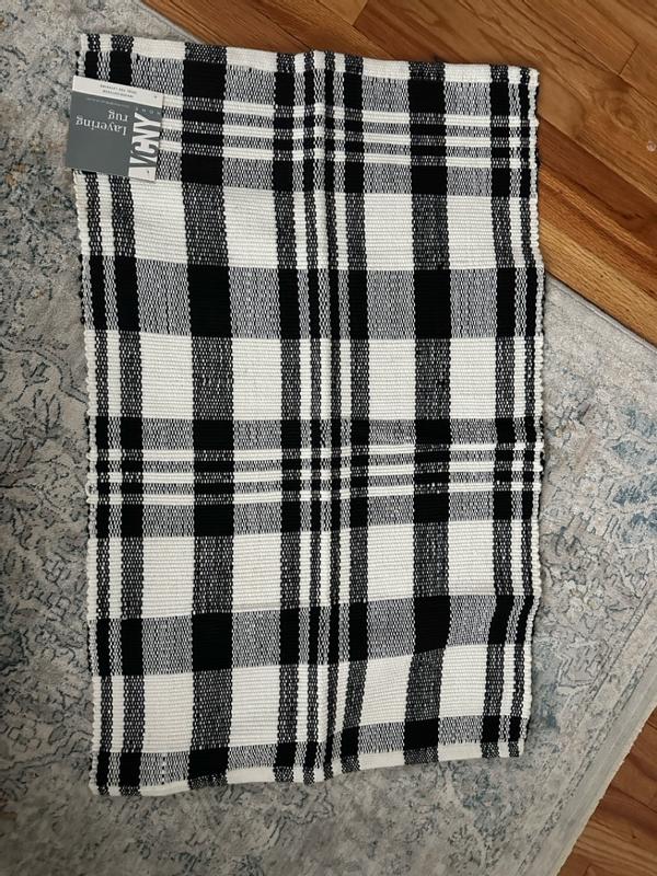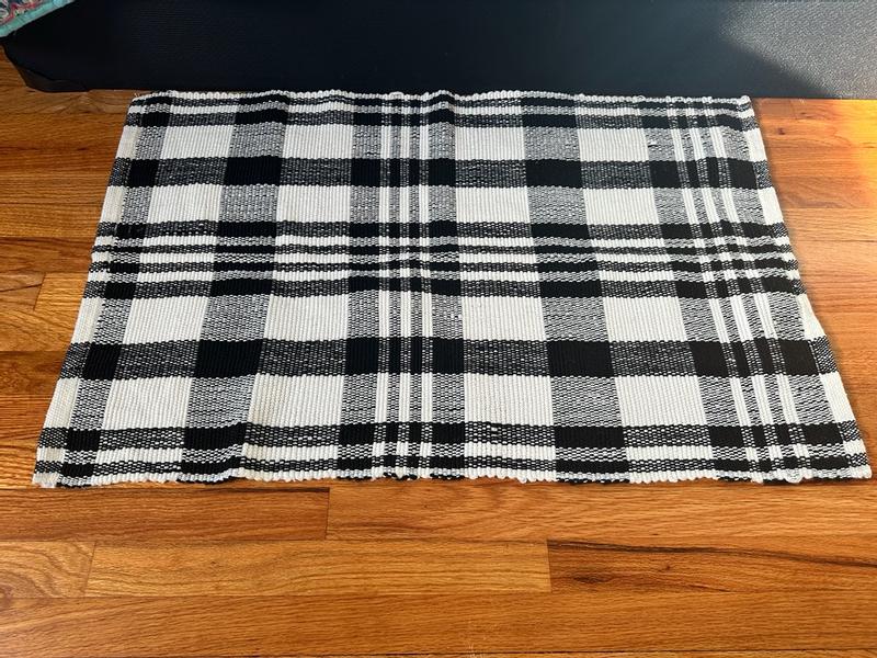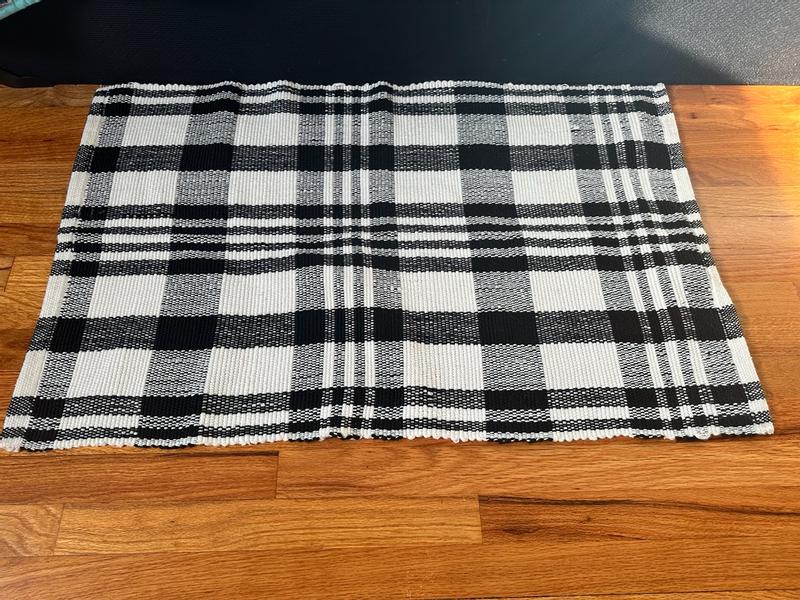 The vcny home layering rug is a beautiful and well made indoor outdoor rug that's ideal for layering it is 24 in by 36 in long. The black and white gingham checker design gives a nice warm country feel. This would look very nice in a modern farmhouse style home. I really enjoy how soft and good quality the material feels. I do wish there was a non-skid backing on it. I also wish it was washable because this looks like it's spot clean only. I look forward to using this rug in my kitchen but it can be used anywhere in the home as well as outside. I also took a picture of the layering effect of being able to put a decorative floor mat over it to give some weight to hold it down as well as give a little pop of design.