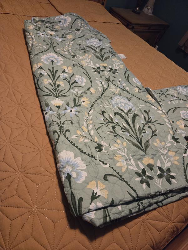 The quilt I received and the quilt in the picture were absolutely not the same item. The picture showed a white background with blue flowers . What I received was a quilt with a sage green background. I actually did not even open the package. It was so obviously not the same as what I ordered from the website picture. Returned immediately. Very disappointed