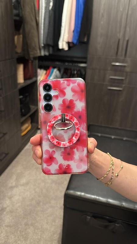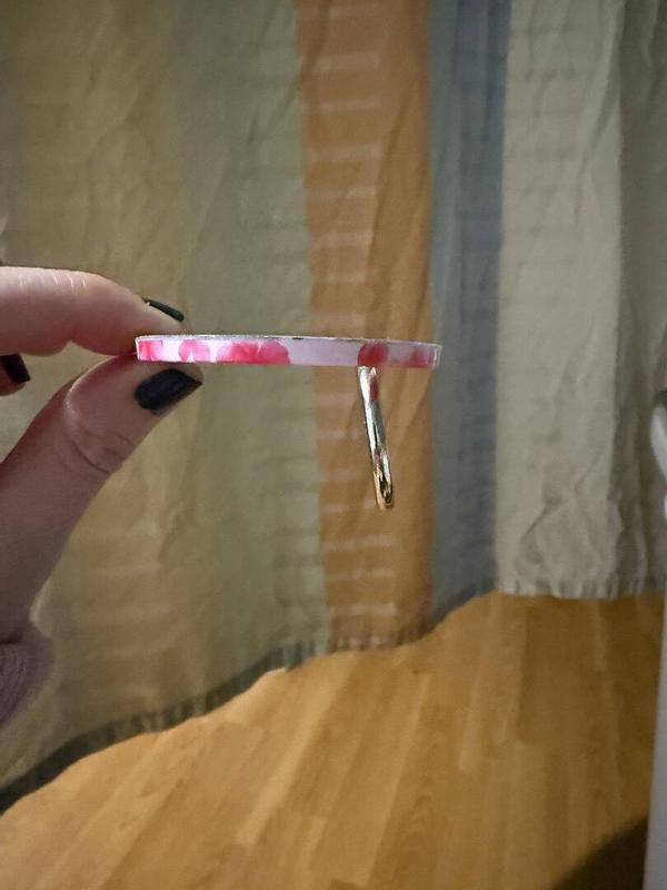 The cherry blossoms are beautiful and the grip stays on very well. I struggle to take it off when I need to charge my phone on the qi charger.