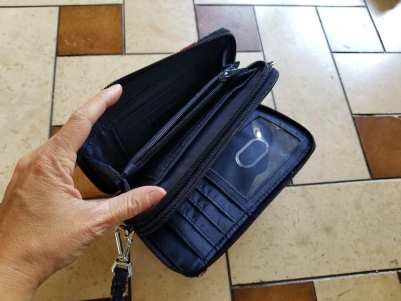 great feature - front snap pocket is perfect size for my phone. sufficient pockets insie for cards, cash. I also use a matching small coin purse for my ID and main card that I can easily take out when I odn't want to carry my full wallet. Only reason it didn't get a 5 star is because someone the wrislet lanyard came off and it's lost. I don't know how it would have disconnected.