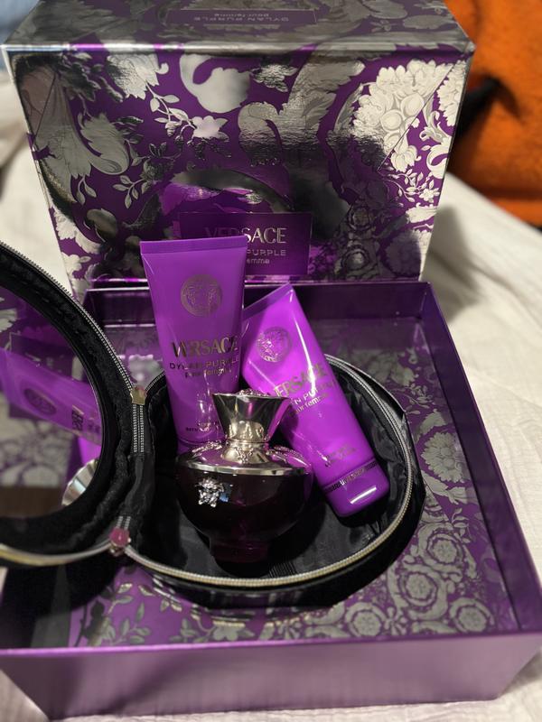 Love this box set, 3.4 size perfume a body wash and a lotion and a bag with mirror for 150! For Versace Dylan purple so happy