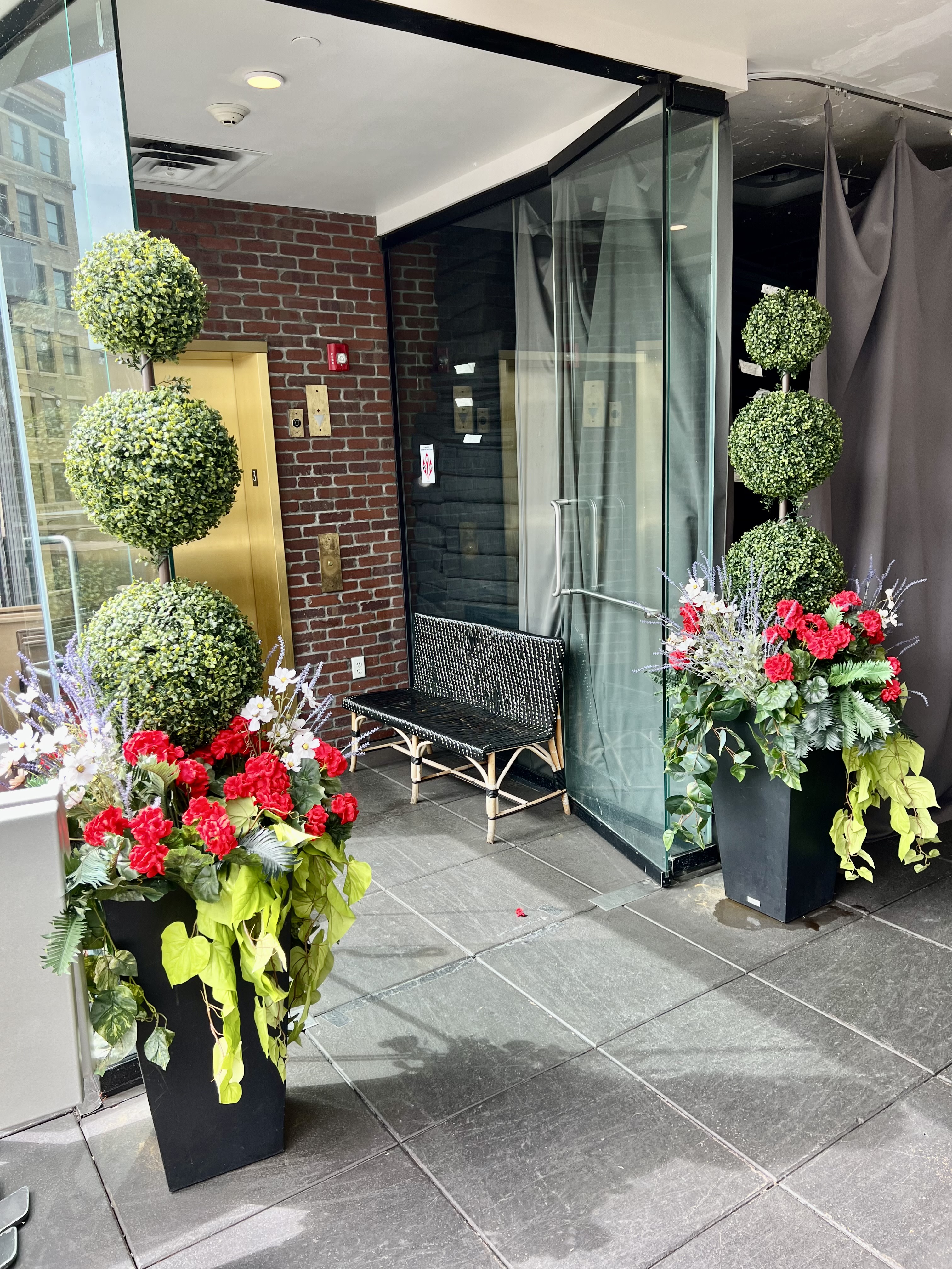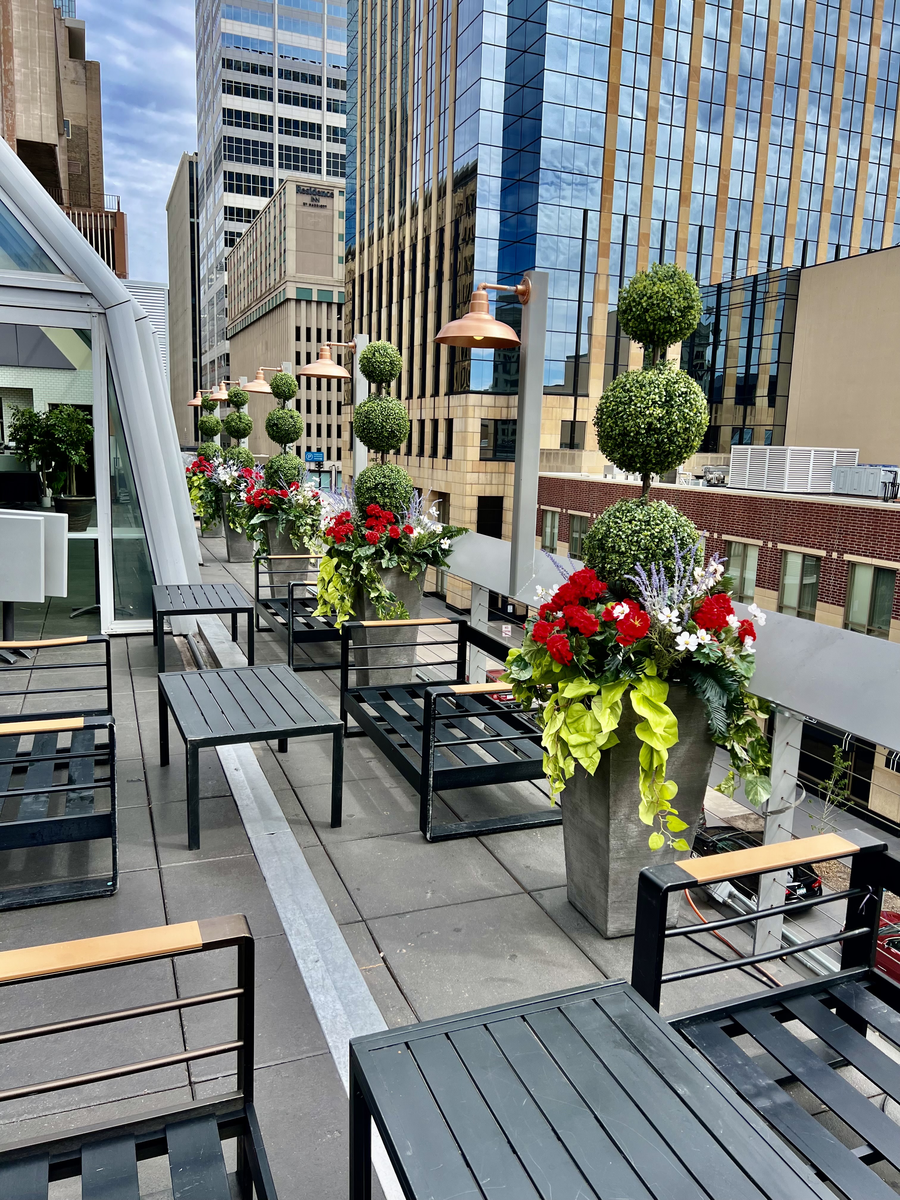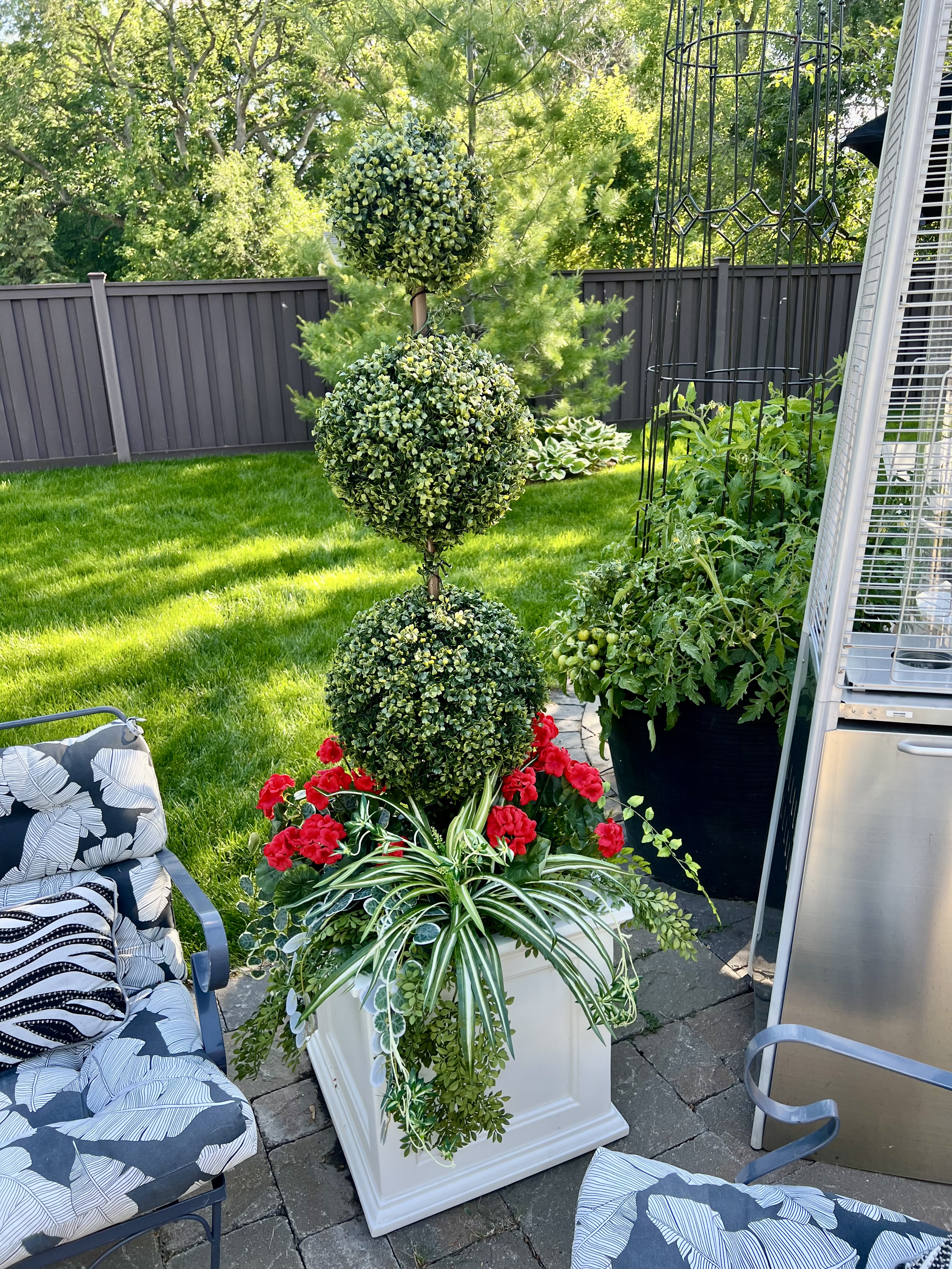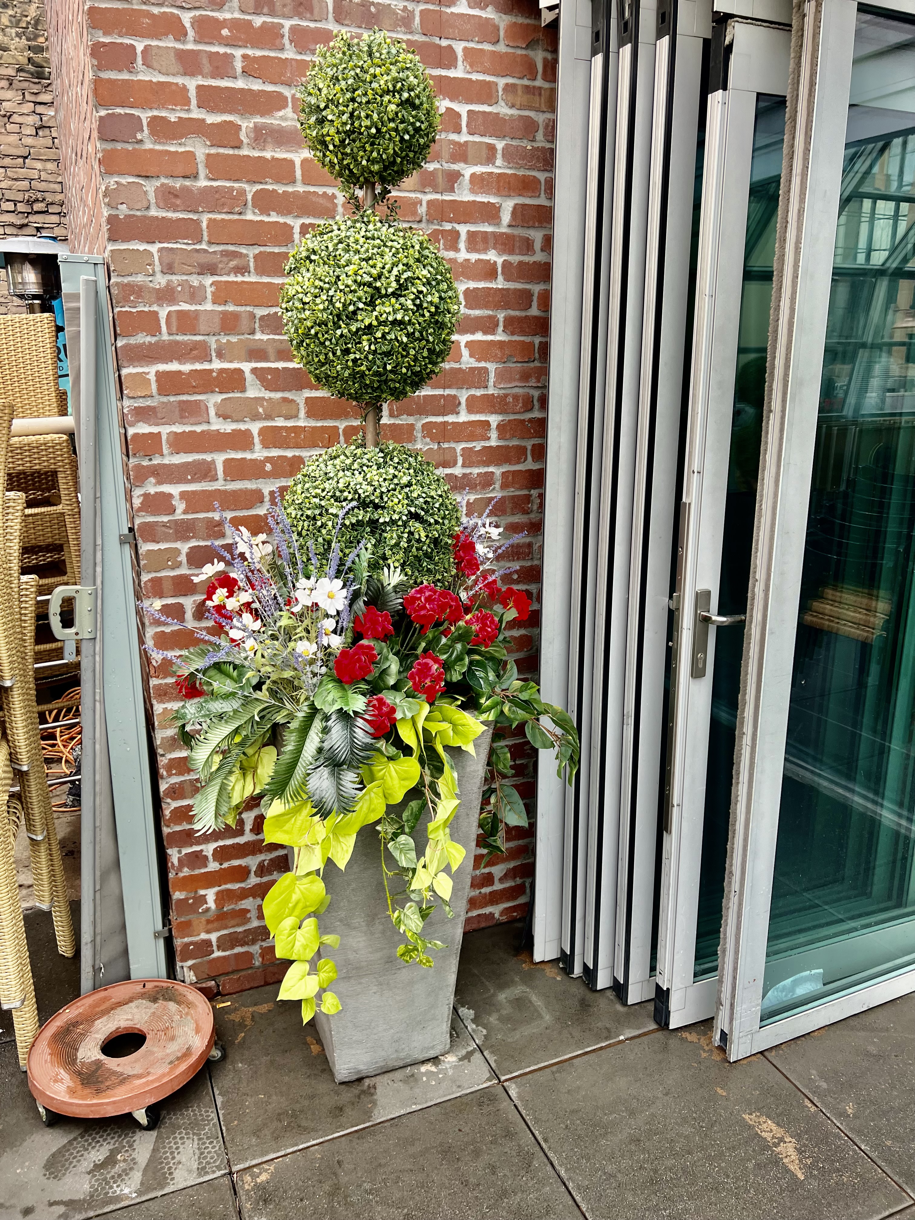 My clients have rooftop patios and love the topiary's. I put solar LED lights on them