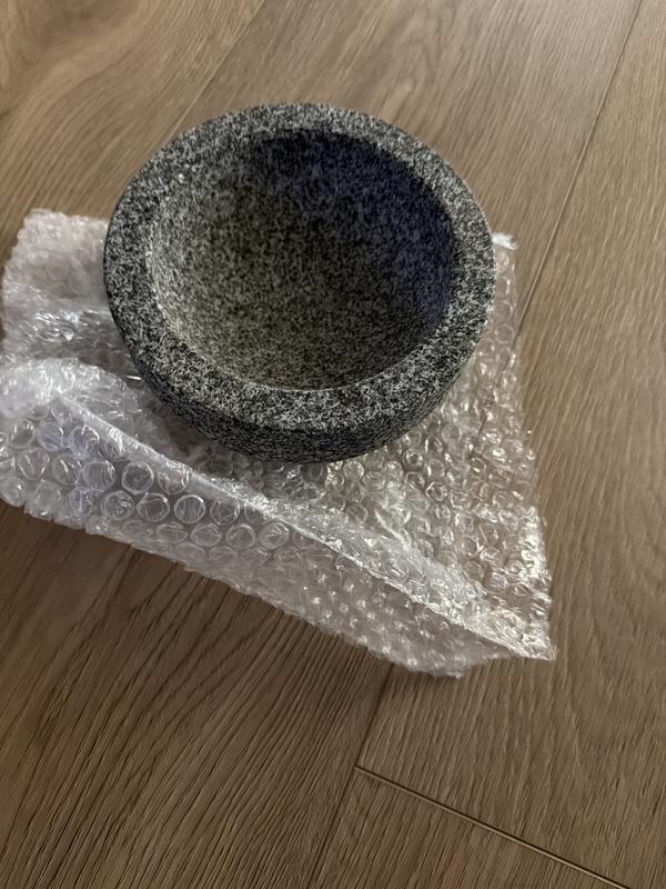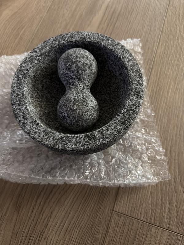 I got it with a little damage on the side, but since I bought this on a sale, I decided to keep it. I liked it because the granite mortal is the perfect size that I wanted. However, the pestle shape is not great.