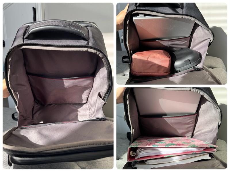 This is a professional sleek looking backpack with plenty of pockets and space for your needs. The padded pocket will protect your laptop and the many exterior pockets help to organize the things you need quick access to while traveling. My only complaint is that I would love if the zipper allowed you to open the backpack flat. I prefer to travel carryon only and it makes packing so much easier when the space is completely accessible.