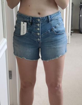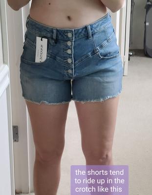 Soft, cute, stretchy. No gap in waistband, but crotch rides up on me when I walk, sit, or move (see "before and after" attached photos). The model in the photo must have an ultra long torso because in reality the buttons don't look high waist at all. I wish these shorts didn't ride up so much, maybe it's because they are so soft and not stiff enough to stay structured. I could probably go a size down with how stretchy they are, when I pull gently on the waistband I can easily make a 2 inch gap, but I think if I sized down they'd be too tight in the thighs. (Ordered size 29, I am 39" hip and 29" waist) Will return because they look goofy when they ride up.