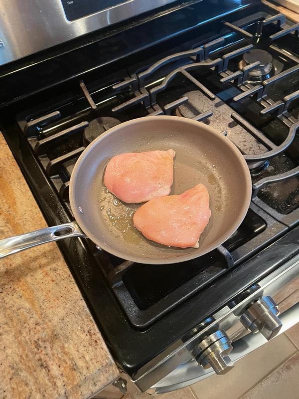 Ordered this set online because a family member recommended it. Opened and used it for the first time today and was very pleased with this pan! I was able to cook at a lower temperature than my older pans and it was cooked in a shorter time! The pans heat up quicker than traditional non-stick and they are much lighter than my older pans set. Highly recommended!