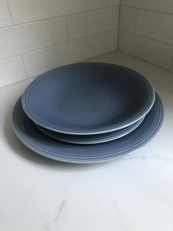 I love this new set of dishes for everyday use. Purchased in the natural white color to coordinate with my kitchen, but the blue is even prettier. The shape of the dinner and salad/sandwich plates is simple but lovely, as is the salad/pasta bowl. All items fit very nicely in the dishwasher racks. I prefer porcelain dinnerware because it’s lighter weight but sturdy, and, as another reviewer mentioned, this set is a little bit heavier than most porcelain. I think that’s because it’s a little thicker. It looks similar to stoneware, but is lighter weight and thinner to take a little less shelf space, and the shiny finish cleans up very easily. I’m very happy with it and expect to use it for a long time.