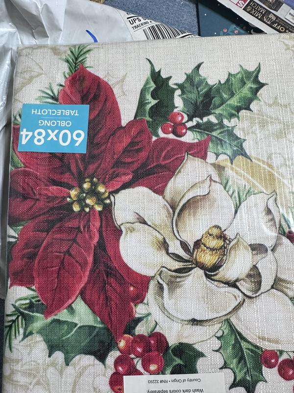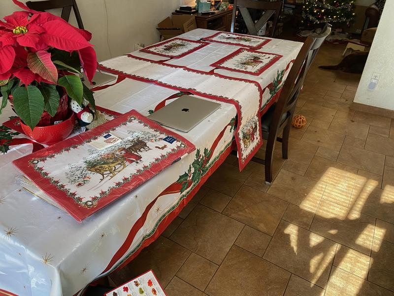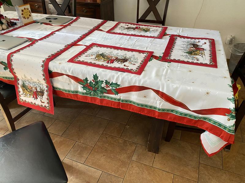 This tablecloth is a nice topper for my Christmas table. The fabric is slightly stiff, not exactly what I expected, but it looks great.