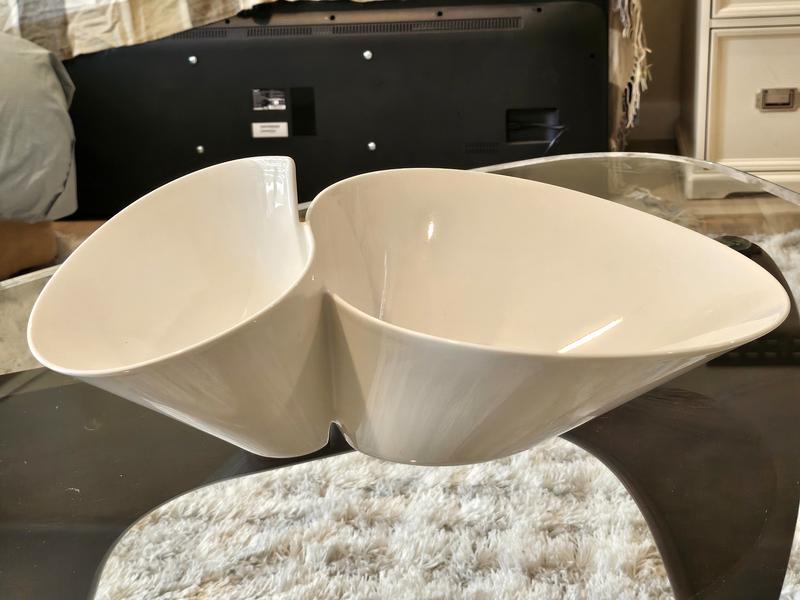 I've had this fluid double bowl for a number of years and still love its look. It is unique and looks great whether displayed on counter or table. It makes a statement empty, filled with fruit or decorations or even used to store small office supplies such as pens and small notepads. It's heavy and stable, never wobbly or prone to chips or beakage. Good purchase (and far less expensive a few years ago!).