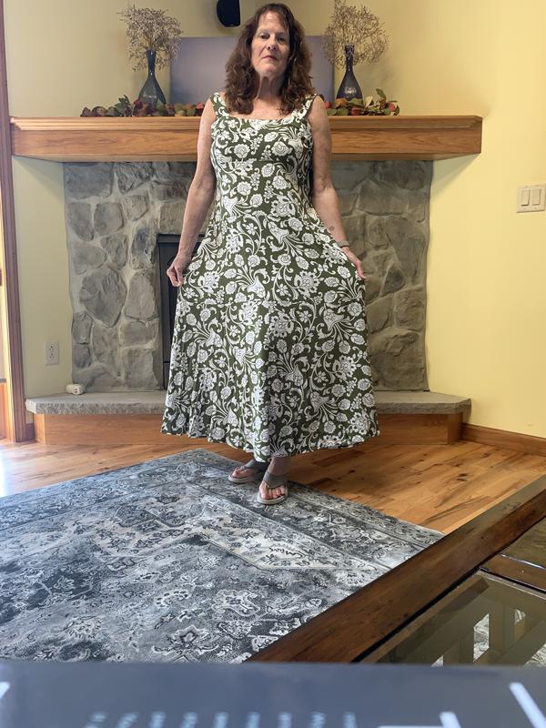Going to a summer wedding, and this dress is very appropriate. I no longer wear sleeveless clothes outside of my home. Age is catching up with me. I have a couple different white shrugs which work very well with the dress. Fabric is lightweight. Even though it is long, it is not yards, and yards of fabric that adds pounds to one's appearance. I m 5'5" tall but dress was a bit longer than I wanted (personal preference), therefore I cut off several inches and rehemed. Think this style dress would compliment any age group.